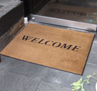ウエルカムといらっしゃいませ入のメッセージマット吸塵性能吸水性能を兼ね備え、安価に営業アピール